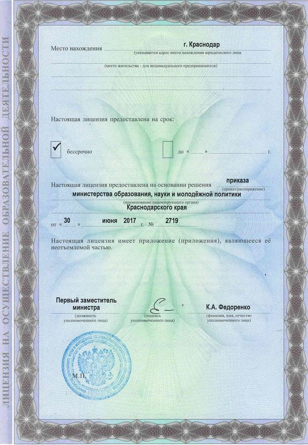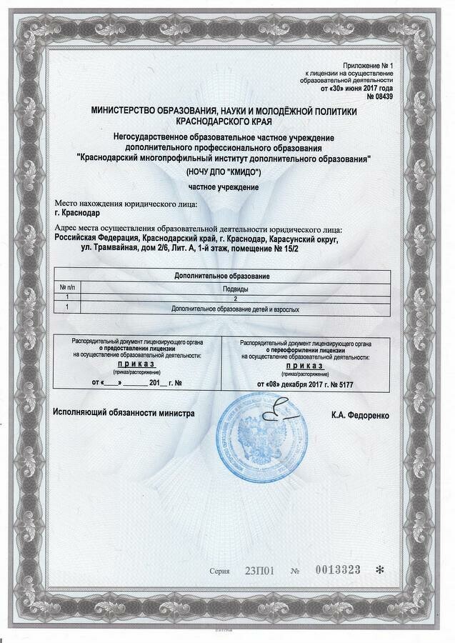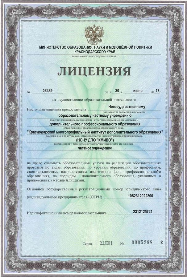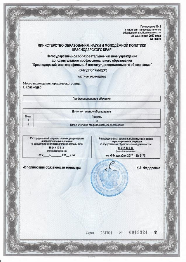 Копия лицензии на осуществление образовательной деятельности (с приложениями) Краснодарского многопрофильного института дополнительного образования (НОЧУ ДПО «КМИДО»):